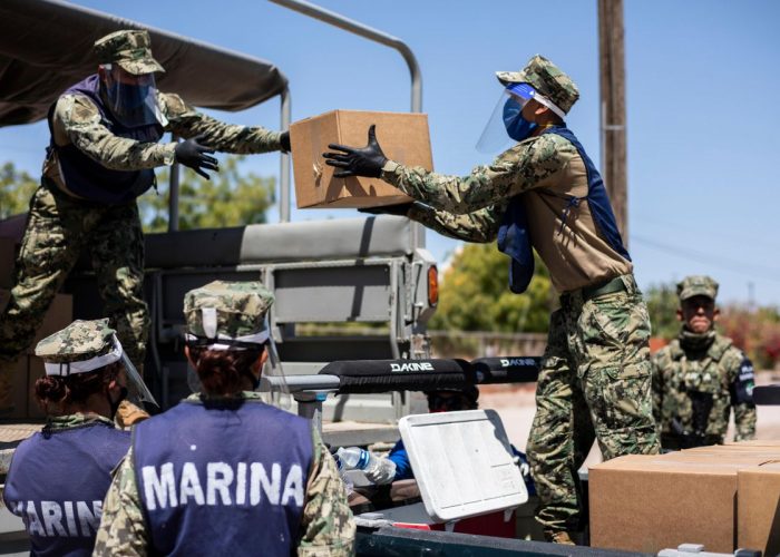 Navy officers unload food pantries from a truck during the distribution of humanitarian aid at El … [read more] Centenario on June 1, 2020 in La Paz, Mexico. (Photo by Alfredo Martinez/Getty Images)