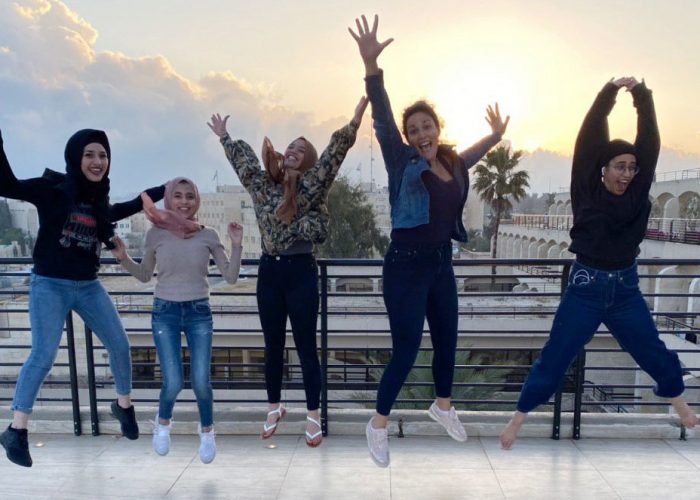 Aysha Abu Shhab (right) and Noam Shuster-Eliassi (second from right) with other COVID-19 patients quarantined by the Israeli military at the Dan Jerusalem Hotel, which became known as “Hotel Corona.”