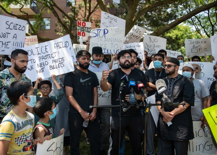 Mr. Choudhary spoke at a news conference on Sunday outside his uncles apartment in Mississaugas Malton neighbourhood, west of Toronto, where about 40 family and friends gathered to call for a public inquiry into the shooting. Some waved signs demanding Justice for Ejaz an echo of the banners carried at recent protests against police brutality and anti-Black racism in the United States, Canada and Europe.