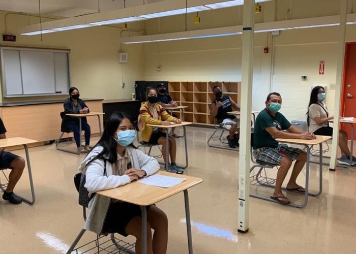 This photo, provided by the Department of Education of Guam, illustrates how student desks could be configured next school year to promote social distancing during the pandemic. This classroom has a maximum capacity of nine – eight students and one teacher.