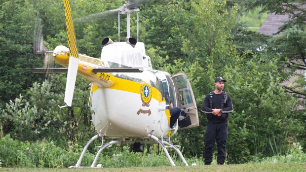 Police have transformed the parking lot of a community centre into a base of operations and helicopters have been taking off and landing at a nearby soccer field.