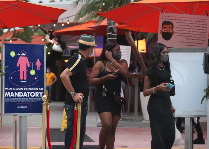 People leave the Ocean 10 restaurant as a curfew from 8 p.m. to 6 a.m. is put in place on Saturday in Miami Beach, Florida.