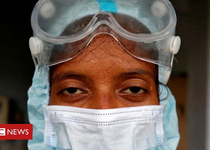 Beads of sweat run down the forehead of a healthcare worker after she took swabs from residents at a residential apartment in Ahmedabad, India. The country has the third largest number of coronavirus cases in the world, after the US and Brazil.