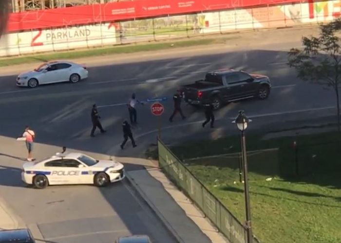 Eret’s video shows the truck’s distraught occupants being detained by police while the truck — closely pursued by police — sped west along Burnamthorpe.