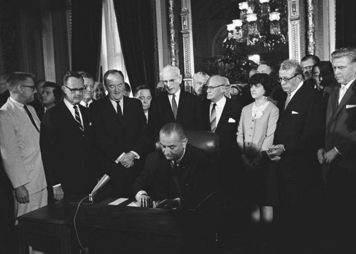 President Lyndon Johnson signing the Voting Rights Act on Aug. 6, 1965, in Washington, D.C. Luci Baines Johnson stands behind the president.
