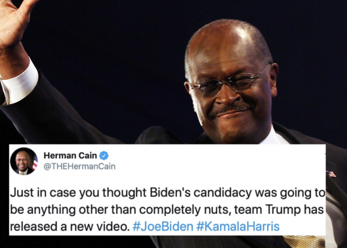 OK, obviously Cain the former Republican candidate for president who died in July after being hospitalized with COVID-19 was not actually tweeting. But his account responded to the news that former Vice President Joe Biden had selected California Sen. Kamala Harris as a running mate on the 2020 Democratic presidential ticket.