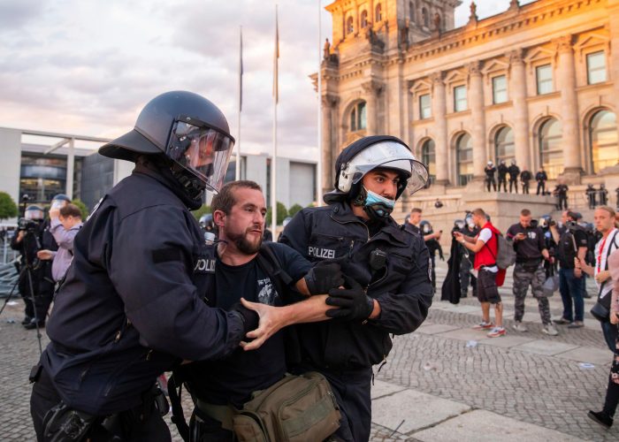 Berlin’s regional government had tried to ban the protests, warning that extremists could use them as a platform and citing anti-mask rallies earlier this month where rules intended to stop the virus from being spread further were not respected.