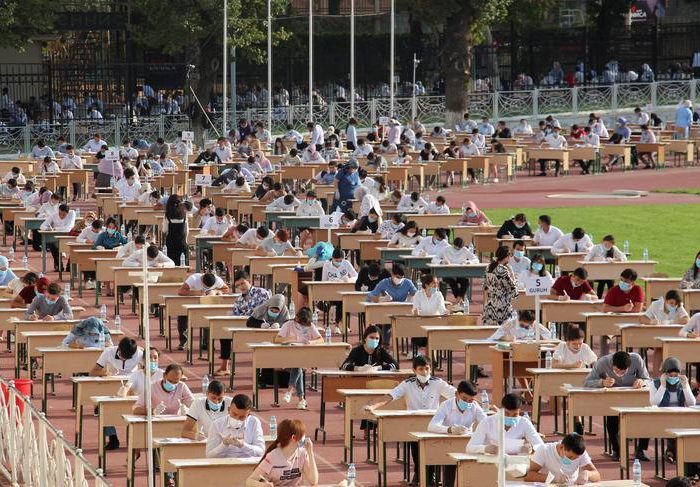 Hundreds of young men and women attended the first session at one of the stadiums in Tashkent on Wednesday morning, wearing masks. The weather was comfortably warm for those seated in the shade while other test-takers used clothes and papers to protect themselves from direct sunlight.