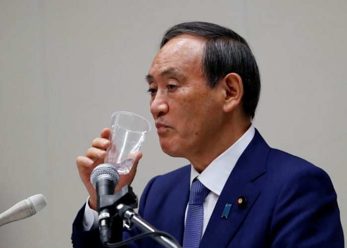 FILE PHOTO: Yoshihide Suga, Japan’s Chief Cabinet Secretary and ruling Liberal Democratic Party (LDP) lawmaker, drinks water during a news conference to announce his candidacy for the party’s leadership election, in Tokyo, Japan, September 2, 2020. REUTERS/Issei Kato/File Photo