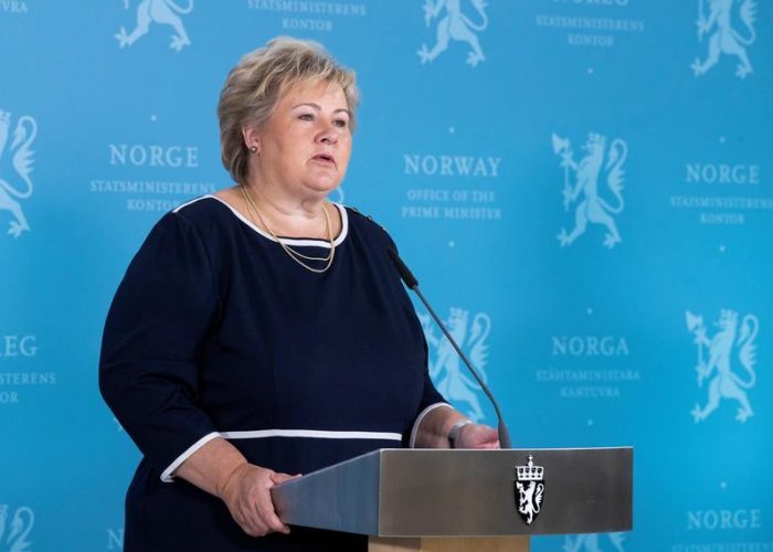 Norway’s Prime Minister Erna Solberg speaks during a news conference about the coronavirus disease (COVID-19), in Oslo, Norway September 3, 2020. Berit Roald/NTB Scanpix/via REUTERS