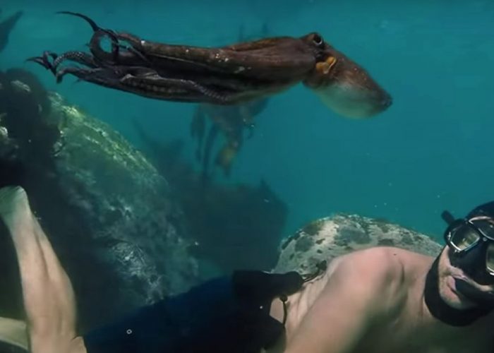 In the footage above, over images of a man hanging out with an octopus in a kelp forest, we get an over-the-top narration explaining that the filmmaker decided to visit the same mollusc every day for a period of time in order to spark a radical change in his life.