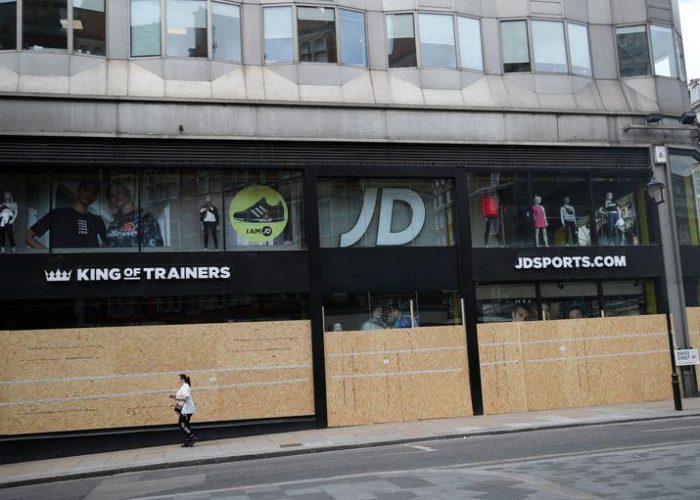 FILE PHOTO: A JD Sports store is seen boarded up in Oxford Street, London, Britain, June 7, 2020. REUTERS/Hannah McKay