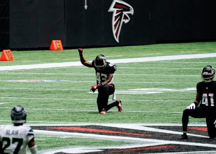 In Atlanta, the teams wore armbands honoring civil rights leader John Lewis and staged the most striking of the day’s gestures: They barely flinched as the opening kickoff landed beyond the end line, took a knee, and remained there for about 10 seconds before trotting off the field to resume the game.