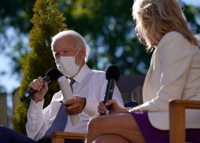 Democratic presidential candidate former Vice President Joe Biden and his wife Jill Biden meet with people in a backyard as they discuss education in Wauwatosa Wis., Thursday, Sept. 3, 2020.
