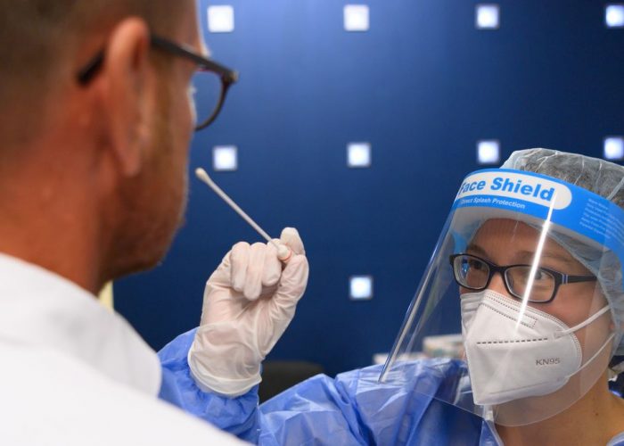 17 September 2020, Saxony, Dresden: Jens Jungmann, spokesman for Saxony’s Minister of Economics, is … [+] having himself tested for the corona virus at the corona test station at Dresden International Airport. The minister and the business delegation have to be placed in domestic quarantine after a trip to Vienna. On 16 September 2020 the Robert Koch Institute declared the Austrian capital a corona risk area. Although Dulig had already travelled on to Linz on Tuesday, the Saxon Corona Protection Ordinance stipulates that everyone who has visited a risk area in the past 14 days must be quarantined. This can also be shortened by a negative test. Photo: Robert Michael/dpa-Zentralbild/dpa (Photo by Robert Michael/picture alliance via Getty Images)