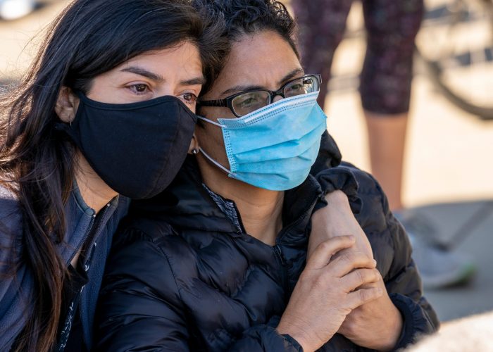 As people gather at the Supreme Court on the day after the death of Justice Ruth Bader Ginsburg, Rosio Marin of Washington, left, comforts a close friend who declined to give her name, as they mourn the loss of one of the court’s liberal justices, Saturday, Sept. 19, 2020 in Washington.