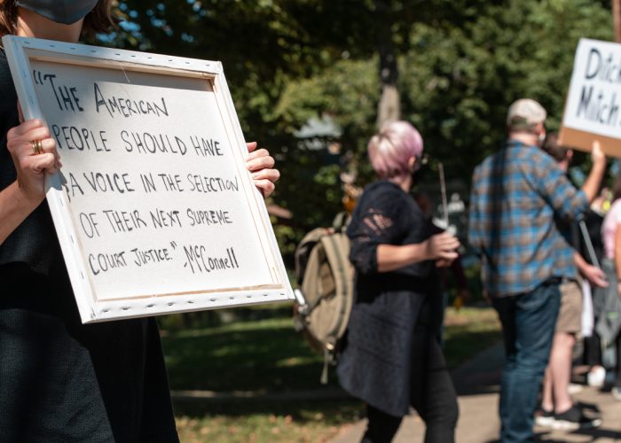 Protesters rally in front of Senate Majority Leader Mitch McConnell’s home in Louisville, Ky., on Sunday. Soon after Justice Ruth Bader Ginsburg’s death, McConnell said President Trump’s court nominee will receive a vote in the Senate.
