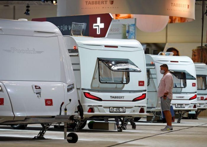 Caravans of German caravan maker Knaus Tabbert are seen at the consumer trade fair “Caravan Salon” for caravans, motorhomes and camping, which is one of the first fairs that opens for visitors since the coronavirus disease (COVID-19) outbreak, in Dusseldorf, Germany, September 4, 2020.