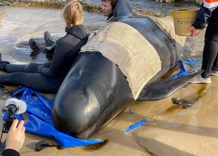 Rescuers try to keep the whales upright to avoid disorientation.