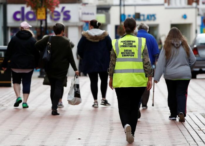 A council worker wearing a safety vest marked ‘social distancing champion’ walks through the town centre following the outbreak of the coronavirus disease (COVID-19) in Wrexham, Britain, September 24, 2020. REUTERS/Phil Noble