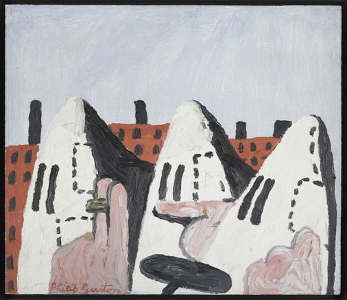 The exhibition had previously been described as including Gustons small panel paintings from 1968 through 1972, a time period in which he was developing his new vocabulary of hoods, books, bricks, and shoes. Some of the figures in Gustons works included cartoonish white-hooded figures smoking cigars, riding in a car, or, in one of Gustons most well-known works, painting a self portrait at an easel.