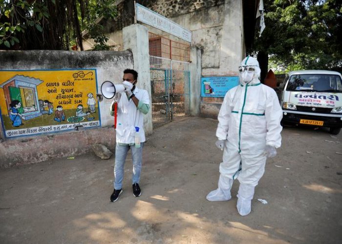A healthcare worker announces to people to get their rapid antigen tests done during a door-to-door survey for the coronavirus disease (COVID-19), in Jakhan village in the western state of Gujarat, India, September 22, 2020. REUTERS/Amit Dave/Files