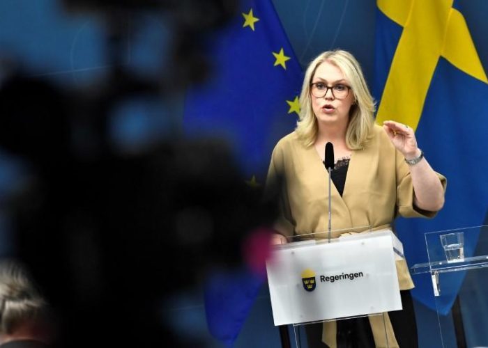 FILE PHOTO: Lena Hallengren, minister for health and social affairs, and Johan Carlson, director general for the Swedish Public Health Agency (not pictured) hold a news conference about restrictions for vulnerable 70+ citizens during the COVID-19 outbreak, in Stockholm, Sweden May 26, 2020. TT News Agency/Claudio Bresciani via REUTERS
