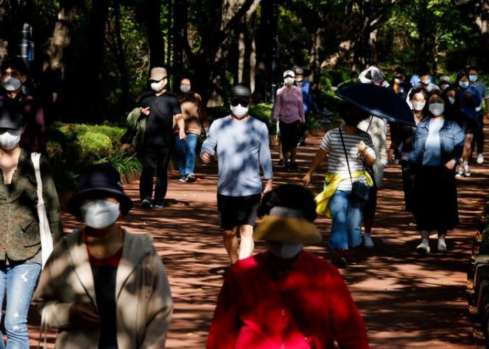 FILE PHOTO: People take a walk as they wear masks to avoid the spread of the coronavirus disease (COVID-19) at a park in Seoul, South Korea, October 5, 2020. REUTERS/Kim Hong-Ji