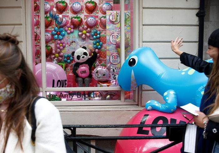 Two people wearing furry animal masks stand in the window amid pink and blue toys and balloons and wave and gesticulate at passers by. Any interaction adheres to social distancing rules as Britain deals with a surge in coronavirus cases.