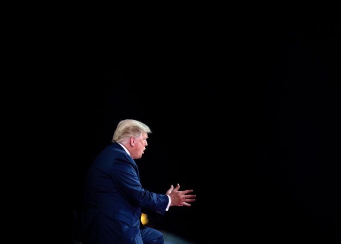 US President Donald Trump gestures as he speaks during an NBC News town hall event at the Perez Art Museum in Miami on October 15, 2020. Credit – Brendan SmialowskiAFP/Getty Images