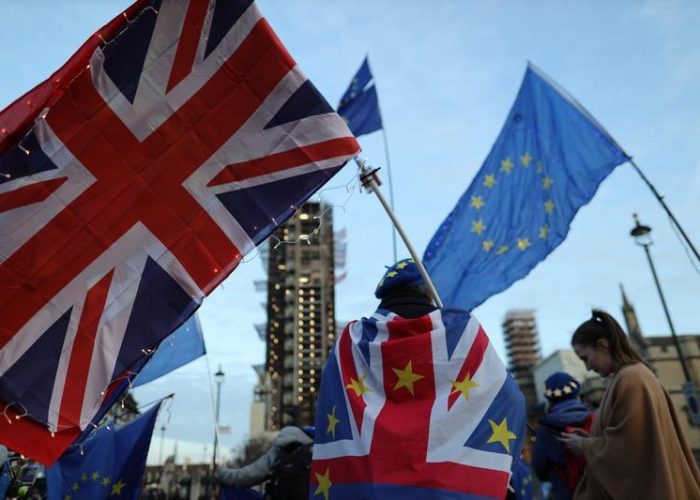 FILE PHOTO: A man is seen holding EU and Britain flag outside the Houses of Parliament in London, Britain January 29, 2020. REUTERS/Antonio Bronic