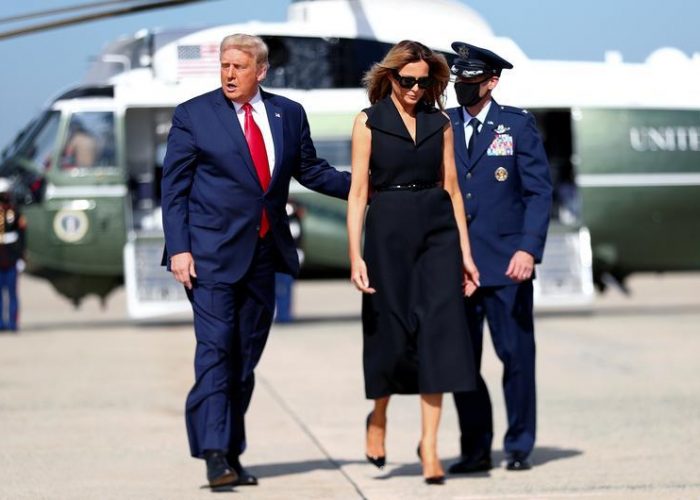 U.S. President Donald Trump walks from Marine One with first lady Melania Trump to board Air Force One as they depart Washington on campaign travel to Nashville, Tennessee to attend his second and final debate with Democratic presidential nominee Joe Biden, at Joint Base Andrews, Maryland, U.S., October 22, 2020. REUTERS/Tom Brenner