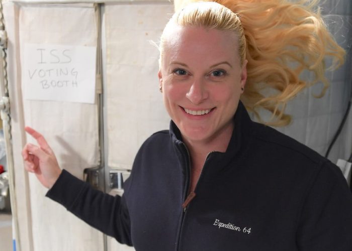 A photo posted on the NASA Astronauts Twitter account shows Rubins in front of a pen-and-paper ISS voting booth sign stuck on the outside of a small cubicle that might also serve as the bathroom for all we know. A comment with the tweet reads: From the International Space Station: I voted today.