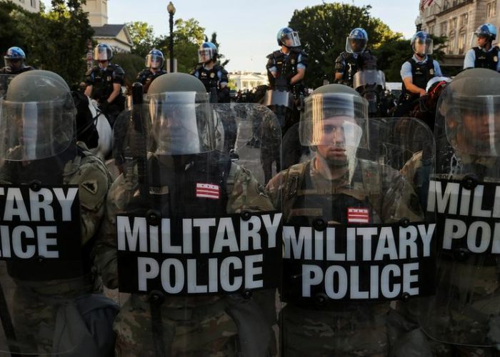 FILE PHOTO: DC National Guard Military Police officers and law enforcement officers stand guard during a protests against the death in Minneapolis custody of George Floyd, near the White House in Washington, D.C., U.S., June 1, 2020. REUTERS/Jonathan Ernst/File Photo