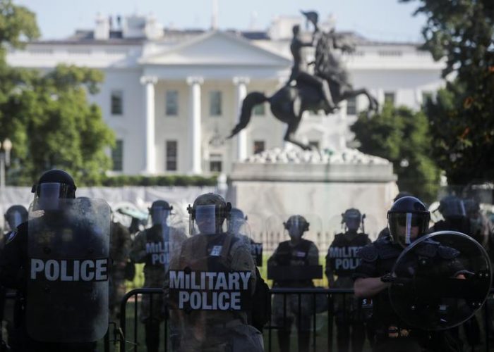 FILE PHOTO: DC National Guard military police officers look on as demonstrators rally near the White House against the death in Minneapolis police custody of George Floyd, in Washington, D.C., U.S., June 1, 2020. REUTERS/Jonathan Ernst/File Photo