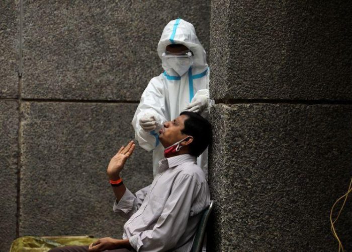 FILE PHOTO: A healthcare worker wearing personal protective equipment (PPE) collects a swab sample from a man amidst the spread of the coronavirus disease (COVID-19), at a testing center in New Delhi, India October 29, 2020. REUTERS/Anushree Fadnavis