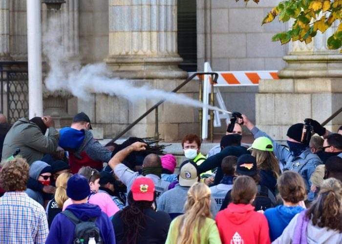 As a result of actions that occurred within the rally, on courthouse grounds, the assembly reached a level of conduct that led to the rally being deemed unsafe and unlawful by unified command, the police statement said. Following warnings that force would be used if people did not disperse after 5 minutes, the department said officers used the pepper spray after several people still remained.
