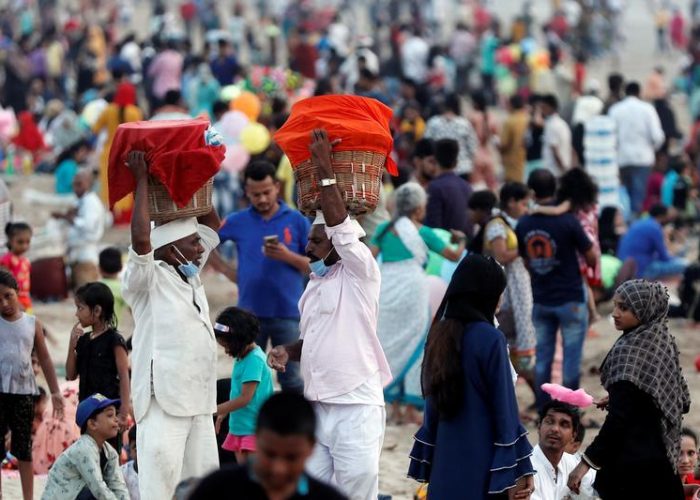 FILE PHOTO: Vendors holding baskets containing ice cream are seen at a crowded beach amidst the coronavirus disease (COVID-19) outbreak, in Mumbai, India, November 1, 2020. REUTERS/Francis Mascarenhas