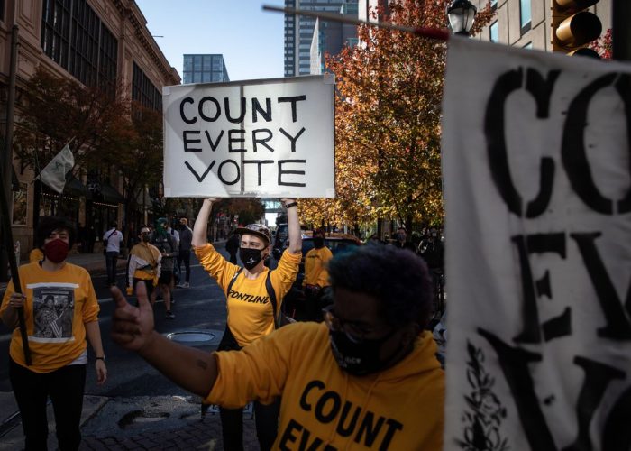 People participate in a protest in support of counting all votes as the presidential election in Pennsylvania is still too close to call on November 5, 2020 in Philadelphia, Pennsylvania.