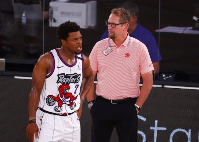 FILE PHOTO: Aug 9, 2020; Lake Buena Vista, Florida, USA; Nick Nurse of the Toronto Raptors talks with Kyle Lowry #7 of the Toronto Raptors during the first quarter against the Memphis Grizzlies at Visa Athletic Center at ESPN Wide World Of Sports Complex. Mandatory Credit: Kevin C. Cox/Pool Photo-USA TODAY Sports
