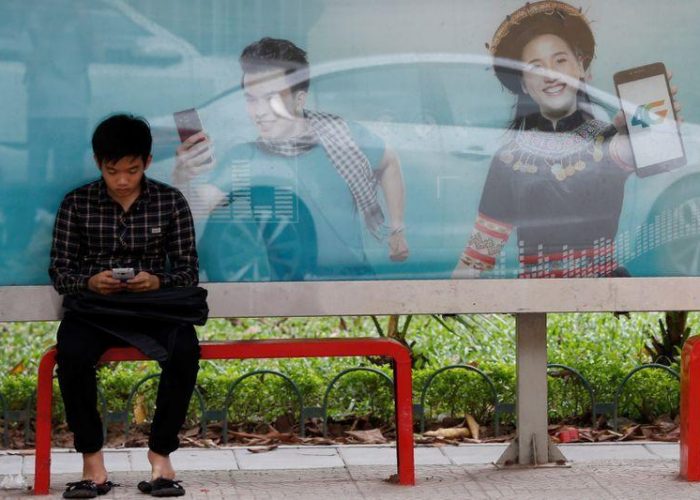 FILE PHOTO: An internet user browses the Internet in front of an advertising billboard for 4G connection service at a bus stop in Hanoi, Vietnam August 29, 2017. REUTERS/Kham