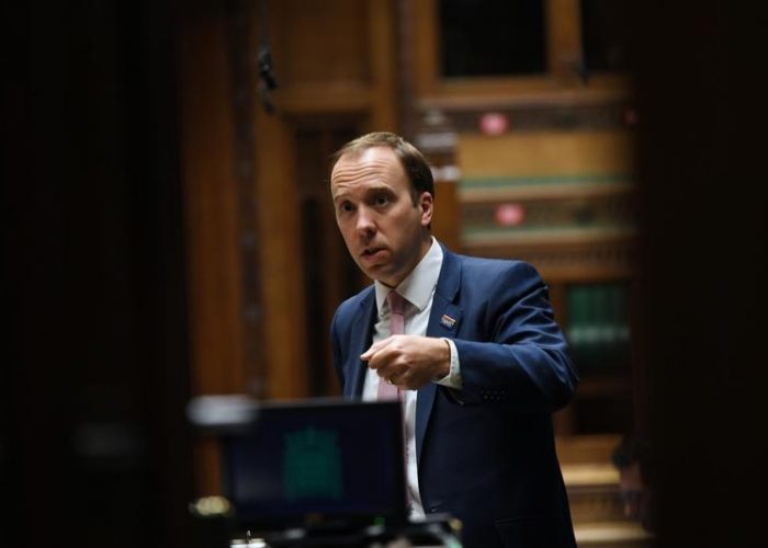 FILE PHOTO: Britain’s Health Secretary Matt Hancock speaks during the general debate on COVID-19 at the House of Commons in London, Britain, October 22, 2020. UK Parliament/Jessica Taylor/Handout via REUTERS