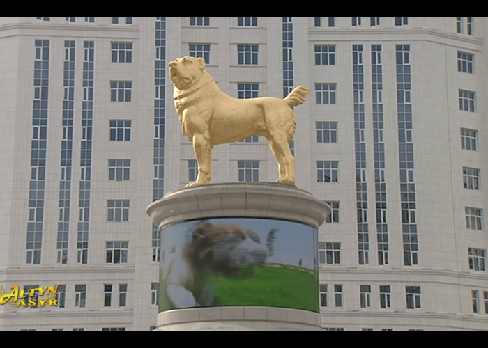The Central Asian shepherd (a breed locally known as Alabai) is immortalized in a 19-foot gold-coated bronze at an Ashgabat roundabout. A screen wrapped around the pedestal plays videos of Alabai dogs playing, protecting sheep, and living their lives. The statue evokes similarities to another gold statue in a nearby junction featuring Berdymukhamedov on horseback.