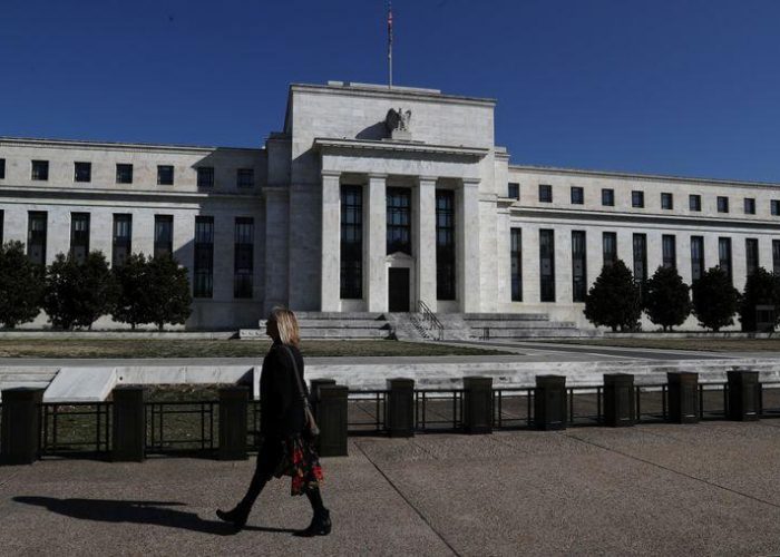 A pedestrian walks past the Federal Reserve Board building on Constitution Avenue in Washington, U.S., March 19, 2019. REUTERS/Leah Millis