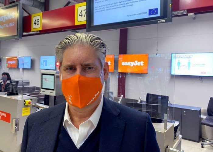 FILE PHOTO: EasyJet CEO Johan Lundgren poses at check in before boarding a flight to new Berlin-Brandenburg Airport (BER) in Schoenefeld, taking off from Berlin Tegel (TXL) airport in Berlin, Germany, October 31, 2020. REUTERS/Klaus Lauer