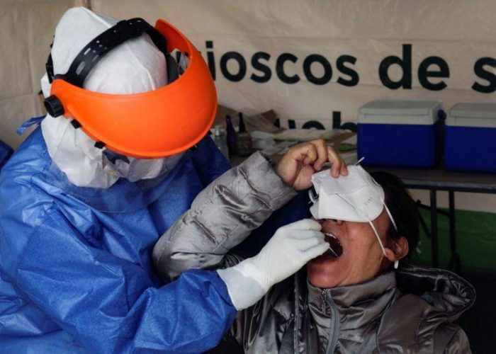 FILE PHOTO: A healthcare worker wearing personal protective equipment (PPE) takes a swab sample from a man to be tested for the coronavirus disease (COVID-19) in Mexico City, Mexico November 6, 2020. REUTERS/Henry Romero