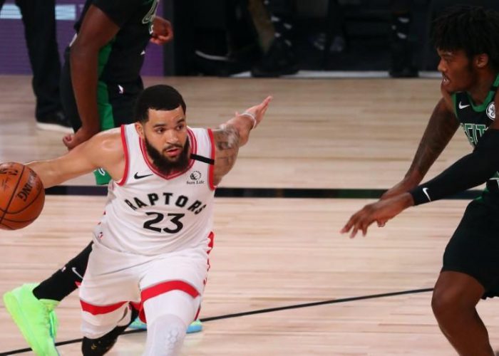 FILE PHOTO: Sep 11, 2020; Lake Buena Vista, Florida, USA; Toronto Raptors guard Fred VanVleet (23) dribbles the ball against Boston Celtics center Robert Williams III (right) during the first half of game seven of the second round of the 2020 NBA Playoffs at ESPN Wide World of Sports Complex. Mandatory Credit: Kim Klement-USA TODAY Sports