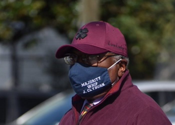 Clyburn pulled up his dark blue mask emblazoned with the words Majority Whip J. Clyburn.
