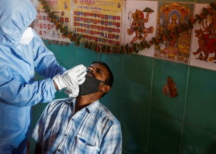 A health worker in personal protective equipment (PPE) collects a swab sample from a man during a rapid antigen testing campaign for the coronavirus disease (COVID-19), at a vegetable market in Mumbai, November 21, 2020. REUTERS/Francis Mascarenhas
