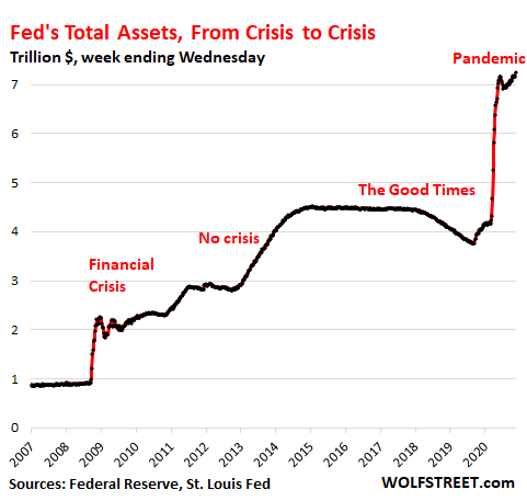 The Fed should have never been allowed to buy corporate bonds and corporate bond ETFs, which trade on the stock market. But it did so anyway for the first time ever. Back during the Financial Crisis, it should have never been allowed to buy mortgage-backed securities, but it did for the first time ever, and now its standard policy and a $2-trillion line-item on the Feds balance sheet.